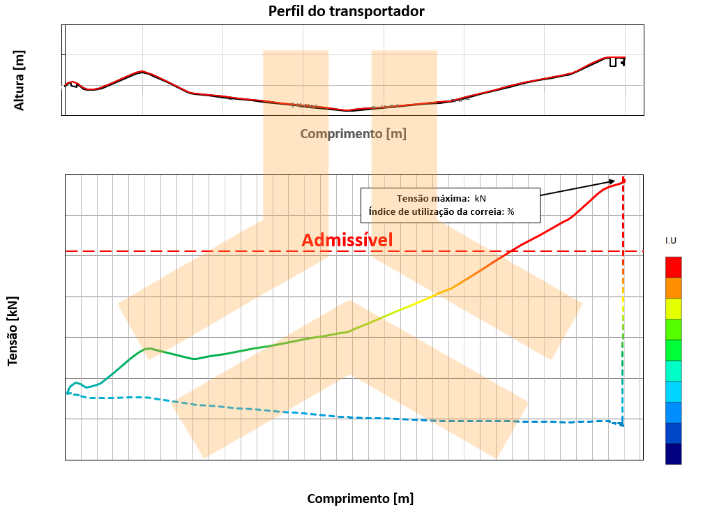 Com base nas tensões de correia calculadas para o regime permanente e para o regime transiente, são realizadas as verificações do índice de utilização da correia, comparando as tensões máximas atuantes com a tensão admissível informada no catálogo dos fabricantes. A Figura 5 apresenta um exemplo de uma verificação realizada para um transportador em que a tensão de correia em regime permanente para a capacidade de projeto é superior à tensão máxima admissível.