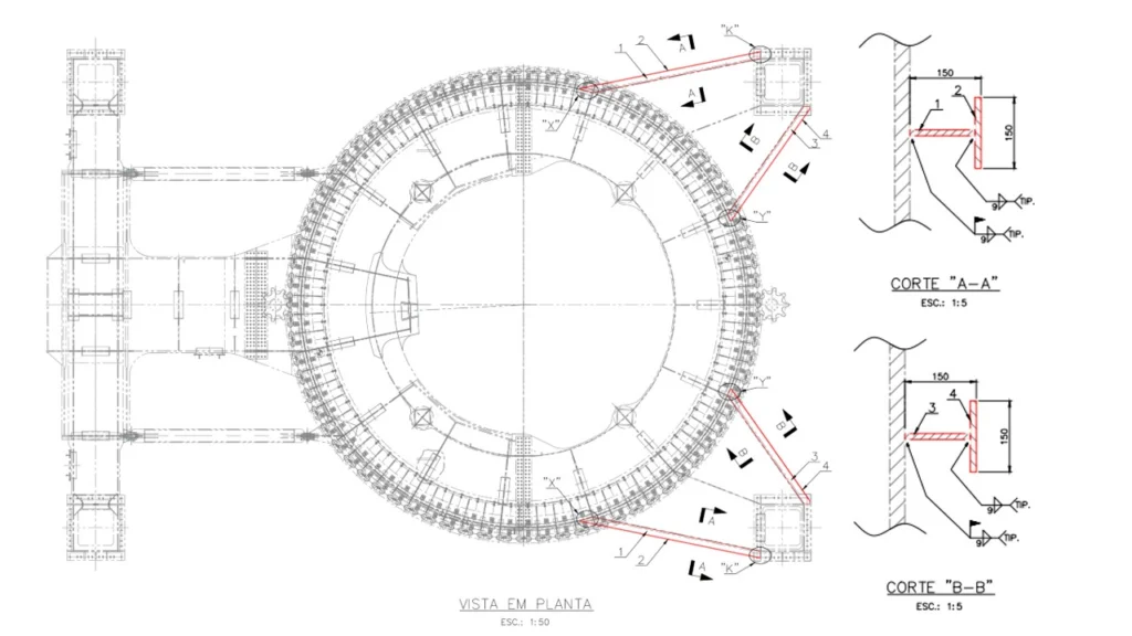 Para os casos em que as análises estruturais, o monitoramento ou as inspeções indiquem a necessidade de intervenção estrutural no equipamento, são avaliadas as melhores alternativas de reforço, considerando aspectos como custo, eficiência, tempo e risco no processo de implantação. Para a não conformidade de projeto identificada na Figura 6 e na Figura 7, no portal da recuperadora de roda de caçambas, foi proposto o reforço apresentado na Figura 10, a seguir: