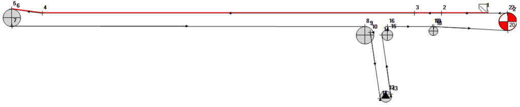 O equipamento também apresentava instabilidades operacionais recorrentes, o que motivou um estudo técnico para apoiar a decisão entre reforma ou substituição. Foram realizadas verificações mecânicas e análises de descontinuidade nos principais sistemas, com apoio do software Helix-DeltaT6 para modelagem dos transportadores, permitindo avaliar com precisão as condições dos componentes e orientar a tomada de decisão. A Figura 1.8 apresenta o perfil do transportador no software em questão.